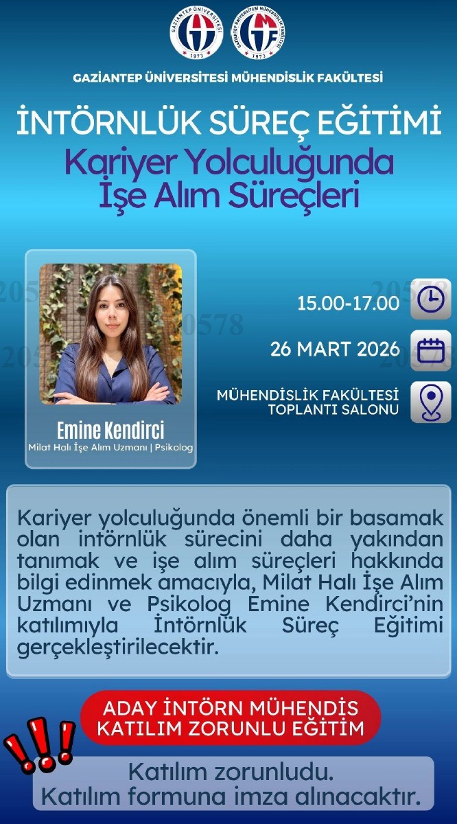 2026-2027 Güz Döneminde intörn olacak öğrenciler için, 26 Mart 2026 tarihinde saat 15.00-17.00 arasında Mühendislik Fakültesi Toplantı Salonu'nda ‘Kariyer Yolculuğunda İşe Alım Süreçleri' konulu eğitim gerçekleştirilecektir. Bu eğitime söz konusu dönemde intörn olacak öğrencilerin katılımı