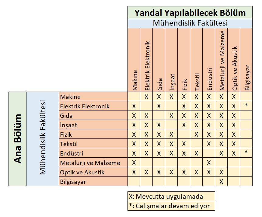 - Makine Mühendisliği, Elektrik-Elektronik Mühendisliği, Gıda Mühendisliği, İnşaat Mühendisliği, Fizik Mühendisliği, Tekstil Mühendisliği, Endüstri Mühendisliği, Metalurji ve Malzeme Mühendisliği, Optik ve Akustik Mühendisliği ve Bilgisayar Mühendisliği bölümlerinden yandal yapılabilmektedir.