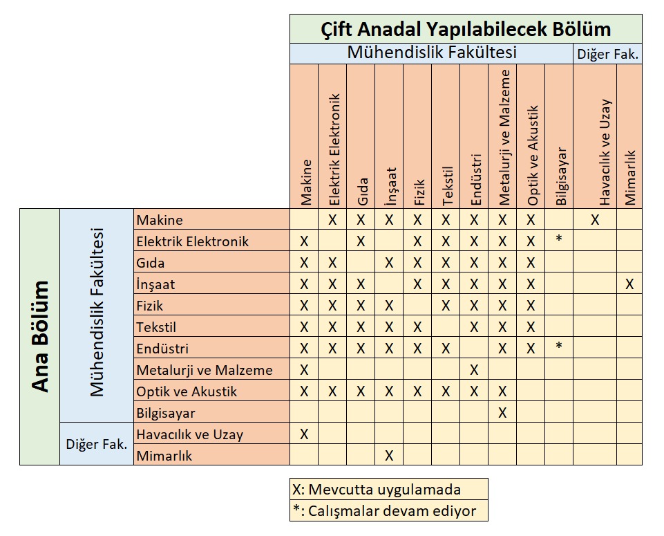 - Mühendislik Fakültesi bölümleri arasında çift anadal yapılabilmektedir.